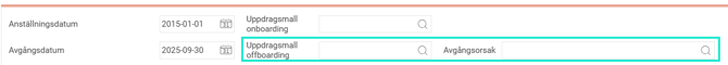 När avgångsdatum läggs in så dyker fälten Uppdragsmall och Avgångsorsak upp. Här fyller du i rätt mall/värde från listan.