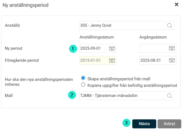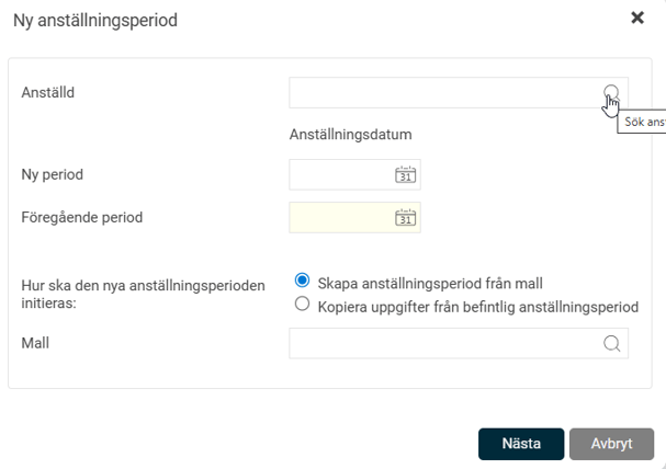- Välj anställningsmall alt. kopiera uppgifter från en befintlig tidigare anställningsperiod.