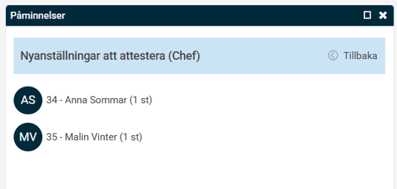 Du ser notis om det finns anställda kvar att granska på startsidan i HRM. Påminnelsen ligger kvar så länge det finns någon anställd kvar att granska.
