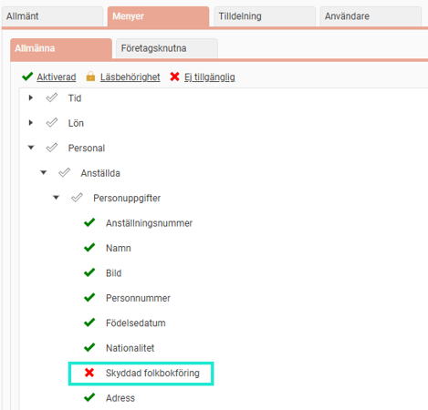Aktivera Skyddad folkbokföring för den roll som ska hantera denna information.
