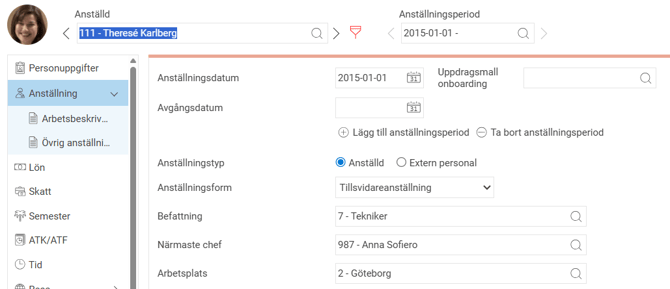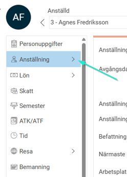 Uppgifter på anställda hittar du genom att klicka på de olika ikonerna på vänster sida på den anställde i anställdaregistret.