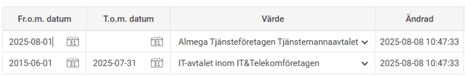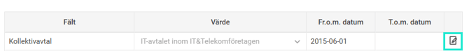 Vissa fält i HRM är byggda med datumhistorik. I de fälten syns endast informationen om det finns ett giltigt värde på den anställde. Du kan se tidigare eller ev. kommande värden på fältet om du klickar på pennan. Det är även via pennan man redigerar fältet.