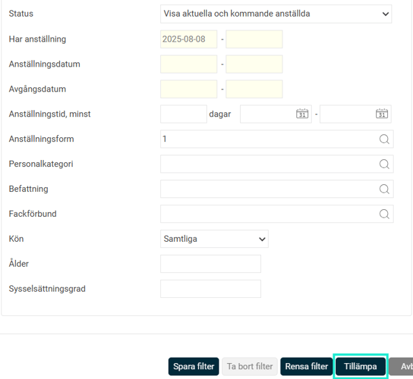 Via filter kan du välja att göra urval på vilka anställda du ser. Röd ikon innebär att det finns ett filter valt. Klicka på ikonen för att se mer information och göra eventuella filtreringar. Här kan du välja om du till exempel bara vill se aktuella och kommande anställda eller om du vill se samtliga anställda dvs även kunna se de som är avslutade.
