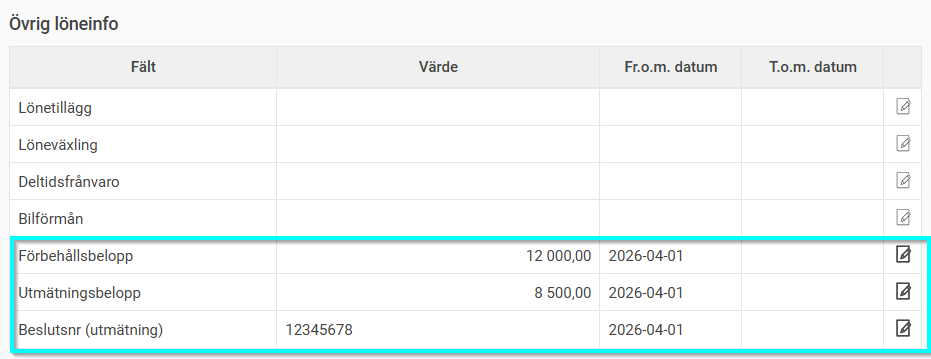 Leta upp fälten för utmätning (dessa är ofta placerade under rubriken Övrig löneinfo.
