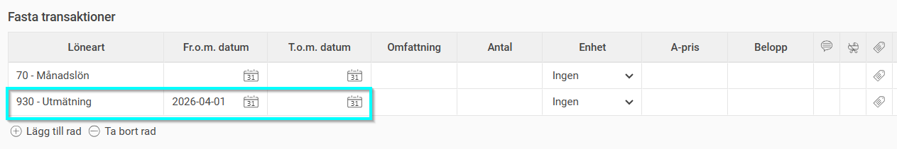 För att avdraget för utmätningen ska dras automatiskt vid varje lönekörning behöver du lägga upp lönearten för utmätning som en fast transaktion på medarbetaren.