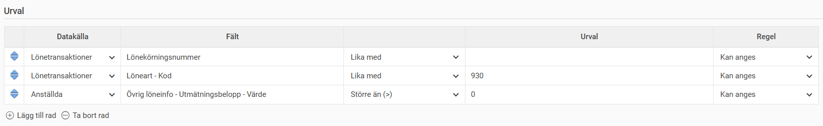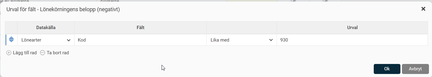 På fältet för Lönekörningens belopp (negativt) ligger ett urval för att hämta draget utmätningsbelopp från löneart 930: