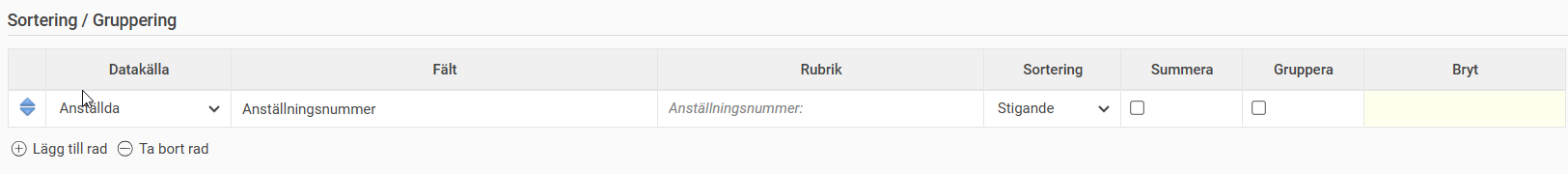 I rapportgeneratorn kan du bygga en rapport för att hämta ut uppgifter om lönekörningens utmätningar för rapportering till kronofogden. Se exempel på rapportens utformning nedan.