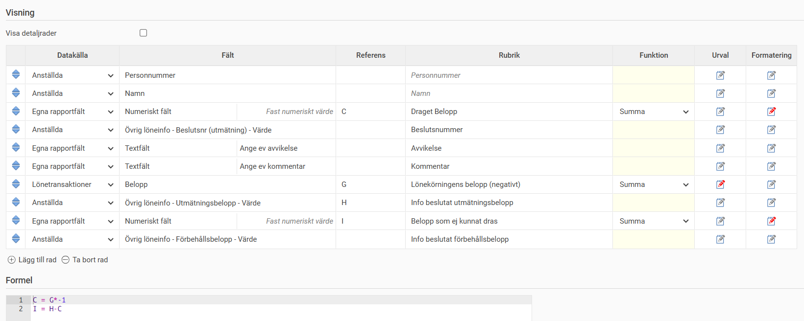 Referenskolumnerna C, G, H, I används i formelfältet för att räkna ut draget belopp som ett positivt belopp i rapporten (C, för inrapporteringen till kronofogden) samt räkna ut det belopp som ej kunnat dras pga förbehållsbeloppet (I).