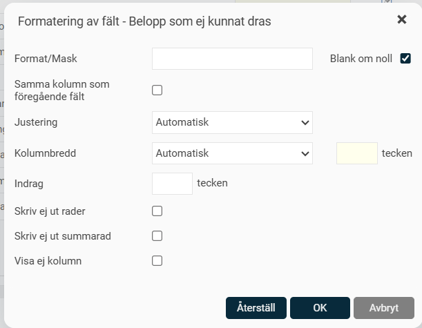 På fältet för Belopp som ej kunnat dras ligger en formateringsinställning för att blanka värdet om resultatet är noll: