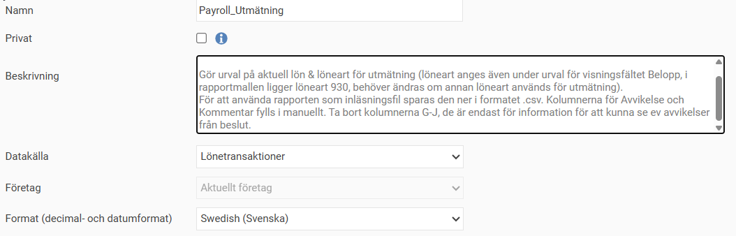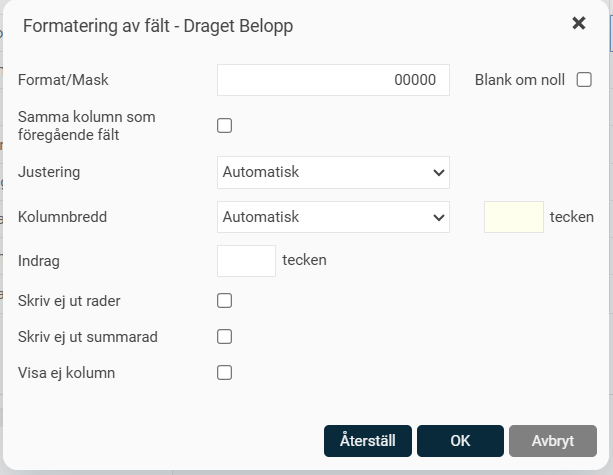 På fältet Draget belopp ligger en formatering för att sätta värdet till fem tecken: