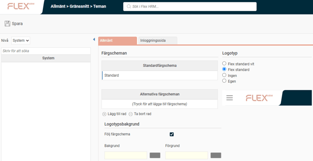 Här kan du välja vilken logotyp som ska visas i det övre vänstra hörnet i Flex HRM.