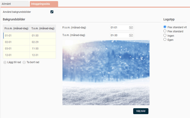 För att visa bakgrundsbilder på inloggningssidan markerar du rutan Använd bakgrundsbilder. Du kan schemalägga olika bilder för olika perioder, till exempel för att matcha årstiderna.