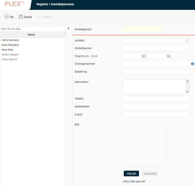 Anställd i Flex HRM Om du väljer en anställd hämtar systemet automatiskt uppgifter som namn och kontaktinformation från personregistret. Endast fältet Information fyller du i manuellt. Uppgifterna uppdateras automatiskt om de ändras i personregistret.