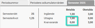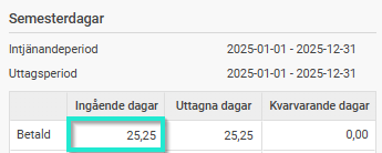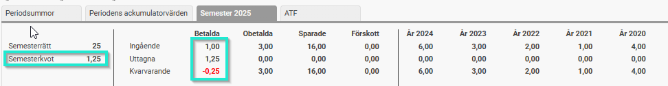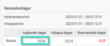 Detta gör att årets betalda dagar får ett utgående värde på -0,25.