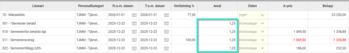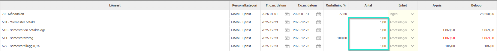 Korrigera antal på lönearten för uttag av betald semester till 1,0.