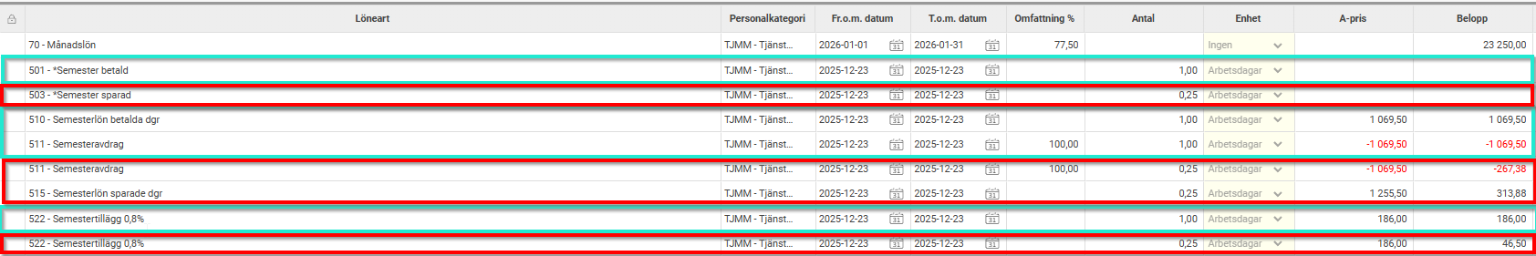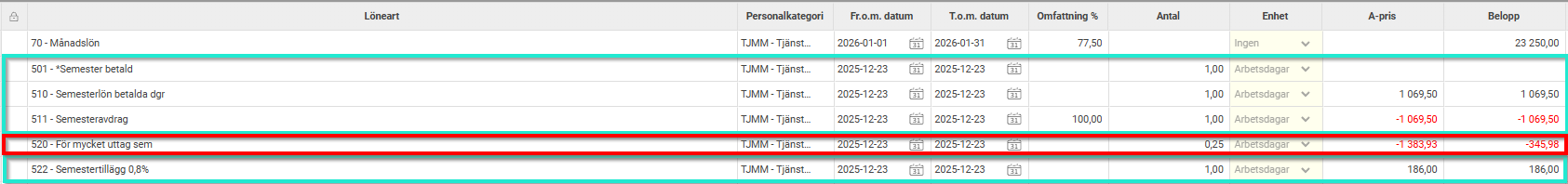 I december 2025 har medarbetaren varit ledig 1 arbetspass och semesteravdrag beräknas i januaris lönekörning med kvoten 1,25. I exemplets semesteravtal görs semesteravdrag samt utbetalas ersättning med semesterlön (4,6%) och semestertillägg (0,8%) per uttagen dag.