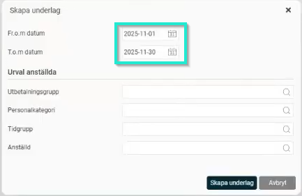 Observera: Om du använder bruten löneperiod skapas underlaget för den motsvarande perioden.