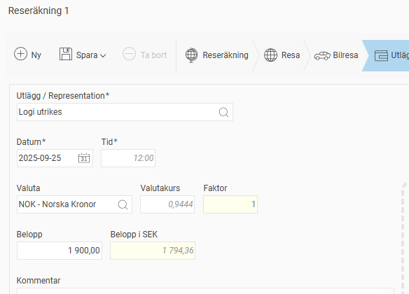 Om du lägger till ett utlägg i en annan valuta hämtas valutakursen automatiskt för det datum då utlägget gjordes. Du ska alltid ange beloppet i den valuta som användes vid köpet.