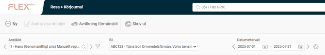 När du ska registrera en ny körjournal i HRM Travel börjar du med att välja rätt bil och tidsperiod.