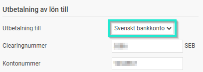 Clearingnummer: Ange det kompletta clearingnumret. Om medarbetaren har Swedbank ska du till exempel ange samtliga fem siffror.