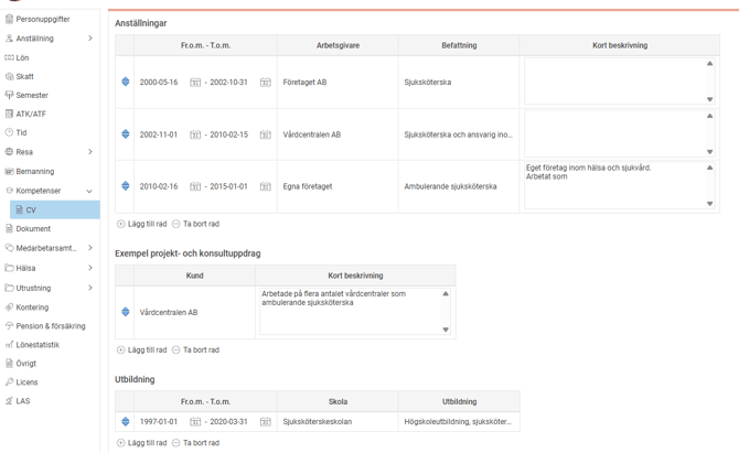Uppgifter om den anställdes kompetenser och kurser kan hämtas från HRM till CV:t.