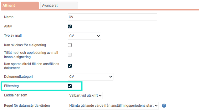 När du lägger upp din mall för CV går det också att ställa in om man vid utskrift av CV ska kunna välja vilka uppgifter som kommer med i utskriften. Detta kan vara användbart om du har gått en lång rad av kurser, men för ett visst projekt vill skapa ett CV som endast innehåller relevanta erfarenheter, kurser och kompetenser. För att möjliggöra filtrering vid utskrift kryssar du i valet Filtersteg.