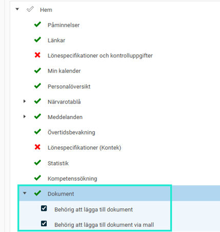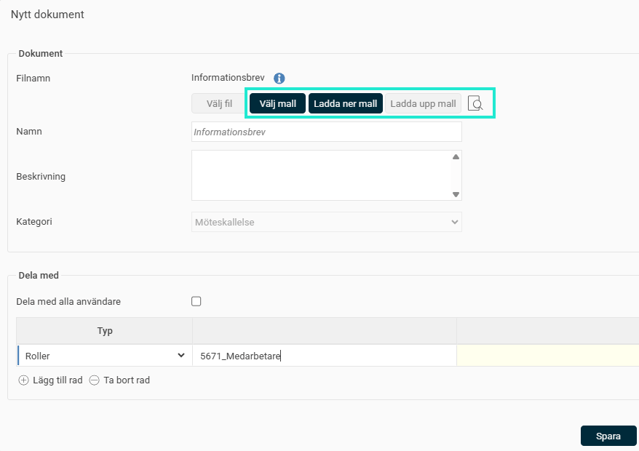För att kunna dela ett dokument, via en mall, med andra via startsidan behöver du först aktivera den behörigheten för berörda roller under Roller.