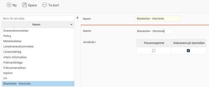 Tänk på att du även behöver ha nedan ruta ibockad för de dokumentkategorier som ska kunna väljas på startsidan. Kontrollera vilka kategorier som kan användas för startsidan under Dokumentkategorier.