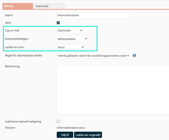 För att kunna dela en mall via startsidan i HRM behöver du lägga upp den under HR-blanketter och välja att Typ av mall är Startsidan. I övrigt gör du på samma sätt som för övriga HR-blanketter, det vill säga fyller i aktuella val och laddar upp din fil. Du kan även i mallarna till startsidan använda dig av taggarna under Tillgängliga taggar. Beroende på vad du väljer under Ladda ner som kommer du få rätt till (Word) eller inte rätt till (PDF) att redigera i mallen innan den delas från startsidan.