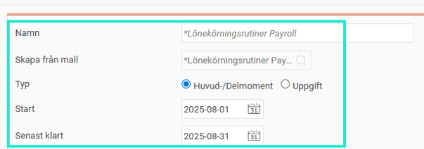 När avgångsdatum läggs in så dyker fälten Uppdragsmall och Avgångsorsak upp. Här fyller du i rätt mall/värde från listan.