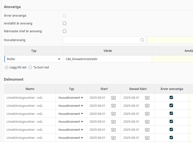 Om du lägger till Ansvariga i uppdrag/uppgifter är det viktigt att tänka på att uppdrag till Roller, i exemplet ovan "Löneadministratör", innebär att alla med den rollen blir tilldelad uppgiften. Det är sedan någon av löneadministratörerna som behöver klarmarkera uppgiften för att den ska anses vara hanterad. Det är alltså ett delat ansvar.