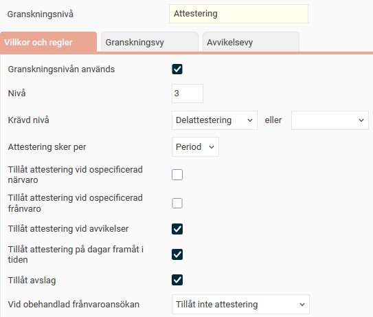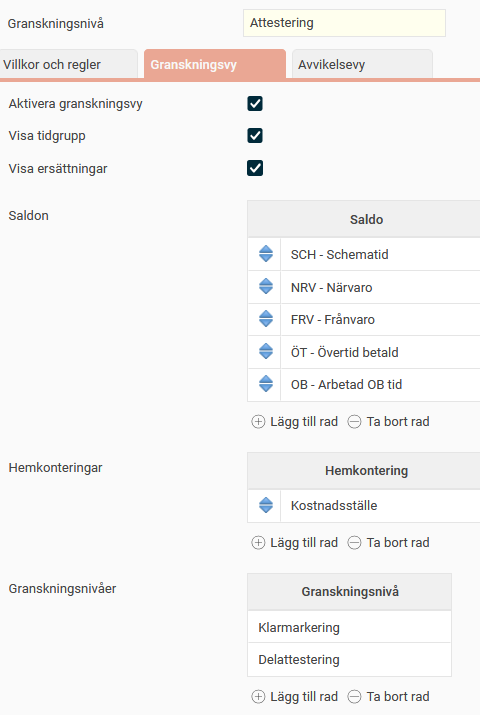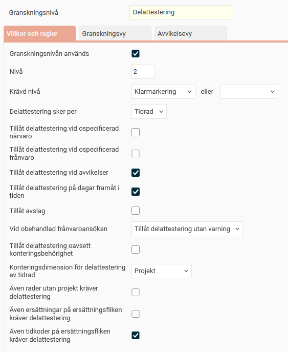 Vi vill att medarbetarna ska utföra granskningen direkt i tidrapporten, utan en separat vy för klarmarkering. Bocka därför inte i Aktivera granskningsvy på fliken Granskningsvy.