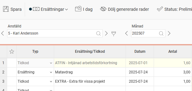 Ersättningskoder skapas under Inställningar > Tid och Bemanning > Ersättningar.