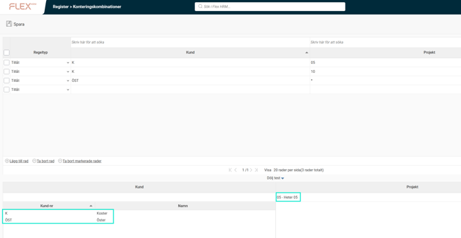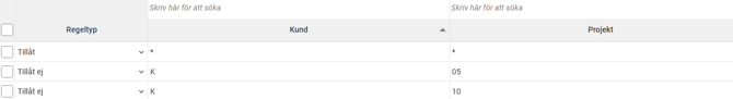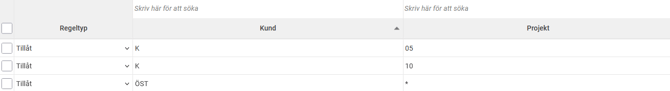 Exempel: På bilden nedan har vi ställt in att kund ÖST kan kombineras med alla projekt, medan kund K endast kan kombineras med projekt 05 och 10.