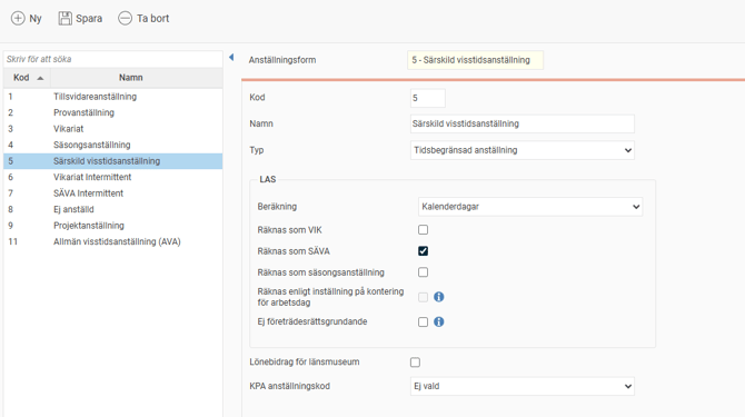 I detta register kan du som administratör lägga upp ett register över de anställlningsformer ni behöver hantera.