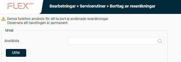 Vill du rensa ett större urval av reseräkningar kan du använda funktionen Borttag av reseräkningar. Denna funktion används för att permanent radera reseräkningar enligt urval. Med denna funktion raderar systemet reseräkningen och sedan kan man lägga ut en ny för samma period.