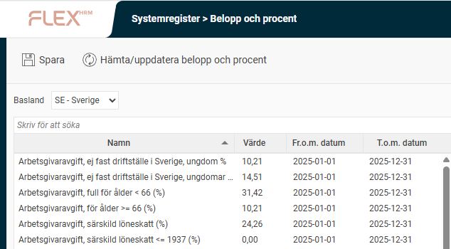 Från och med version 2023.10 hämtas belopp och procent automatiskt in till Flex HRM. Möjligheten att hämta värden manuellt finns fortfarande kvar och kan användas vid behov. Värden hämtas allteftersom de finns tillgängliga. Observera att tillgängligheten beror på när respektive lands myndigheter publicerar värden för det nya året.