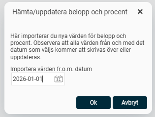 För att manuellt hämta värden kan du gå in under Administration > Systemregister > Belopp och procent och klicka på ikonen ”Hämta/uppdatera belopp och procent”.