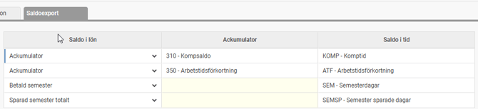 Saldo i lön: Du kan exportera antingen en ackumulator (till exempel komptid, tidbank eller arbetstidsförkortning) eller ett saldo (till exempel semester eller arbetstidsförkortning via funktionen för ATK/ATF avtal).