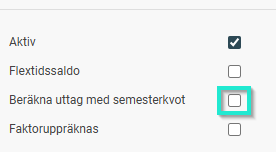 För att exportera semesterdagar och i HRM Time visa upp nettovärdet (bruttodagar / aktuell semesterkvot) behöver saldot vara inställt att ej beräkna uttag med semesterkvot (dvs denna ruta ska ej vara ibockad).