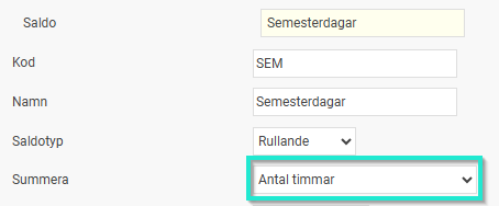 För att exportera semesterdagar omvandlat till timmar behöver mottagande saldo i HRM Time vara inställt att summera Antal timmar.