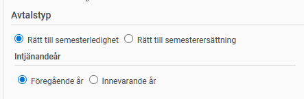 Intjänandeår: Ange om systemet ska räkna innevarande år eller föregående år som intjänandeår.