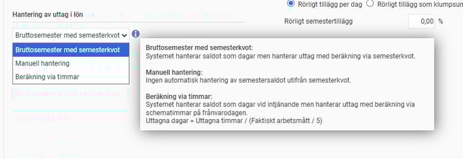 Hantering av uttag i lön: Ange hur systemet ska beräkna uttagen semester i löneberedningen. Detta är särskilt viktigt för anställda som arbetar oregelbundet och har en semesterkvot. Välj Beräkning via timmar om du vill att systemet ska hantera saldot i timmar istället för dagar. Klicka på i-symbolen i systemet för att få mer information om hur du bör tänka kring dessa val.