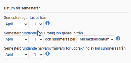 Semestergrundande närvaro/frånvaro för uppräkning av lön summeras från: Ange från vilket datum semestergrundande närvaro/frånvaro ska summeras på semesteråret. T.ex. 1 januari eller 1 april.