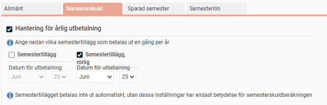 Under fliken Semesterskuld hanterar du inställningarna för den årliga utbetalningen av både det ordinarie semestertillägget och det rörliga semestertillägget.Här anger du vilket datum utbetalningen ska ske. Detta datum är viktigt för systemets beräkningar: