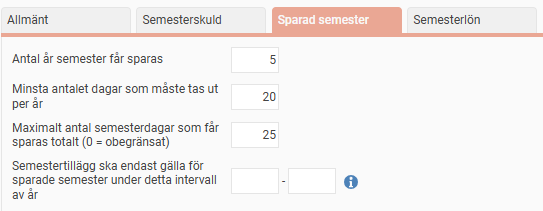 Under fliken Sparad semester ställer du in reglerna för hur anställda får spara sina semesterdagar över flera år.-