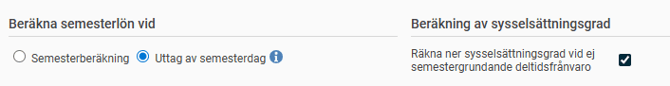 Om ej semestergrundande deltidsfrånvaro ska minska värdet på semesterdagarna används denna inställning för att räkna ut en genomsnittlig sysselsättningsgrad på närvaron för semesteråret. I formeln används då formelfunktionen SyssgradIntjanande() för att hämta upp den genomsnittliga sysselsättningsgraden.