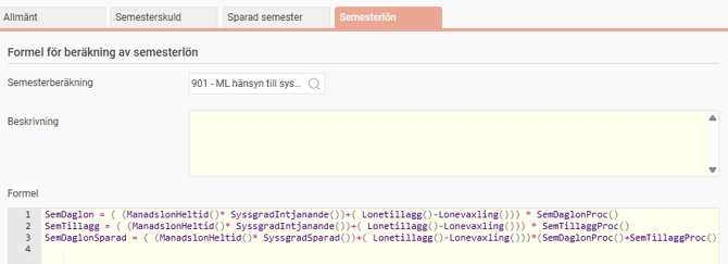 - Semestertillägg ska endast gälla för sparade semester under detta intervall av år: Om semestertillägg på sparade dagar endast ska inkluderas för ett visst intervall av år, t.ex. för att man efter ett visst år utbetalar semestertillägget i klump, anges intervallet här. För att semestertillägg ska inkluderas för sparade dagar på angivna år i intervallet måste detta också beräknas i formeln med hjälp av formelfunktionen SemTillaggProc().