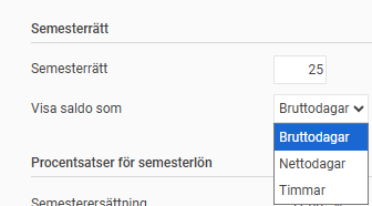 Med valet att visa saldo som Nettodagar kommer semstersaldo att visas som nettodagar på lönespecifikationen för anställda som har det aktuella semesteravtalet.