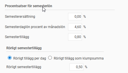 Rörligt semestertillägg: Välj om programmet ska beräkna det rörliga tillägget per dag eller per år. Här anger du även procentsatsen för det rörliga tillägget.